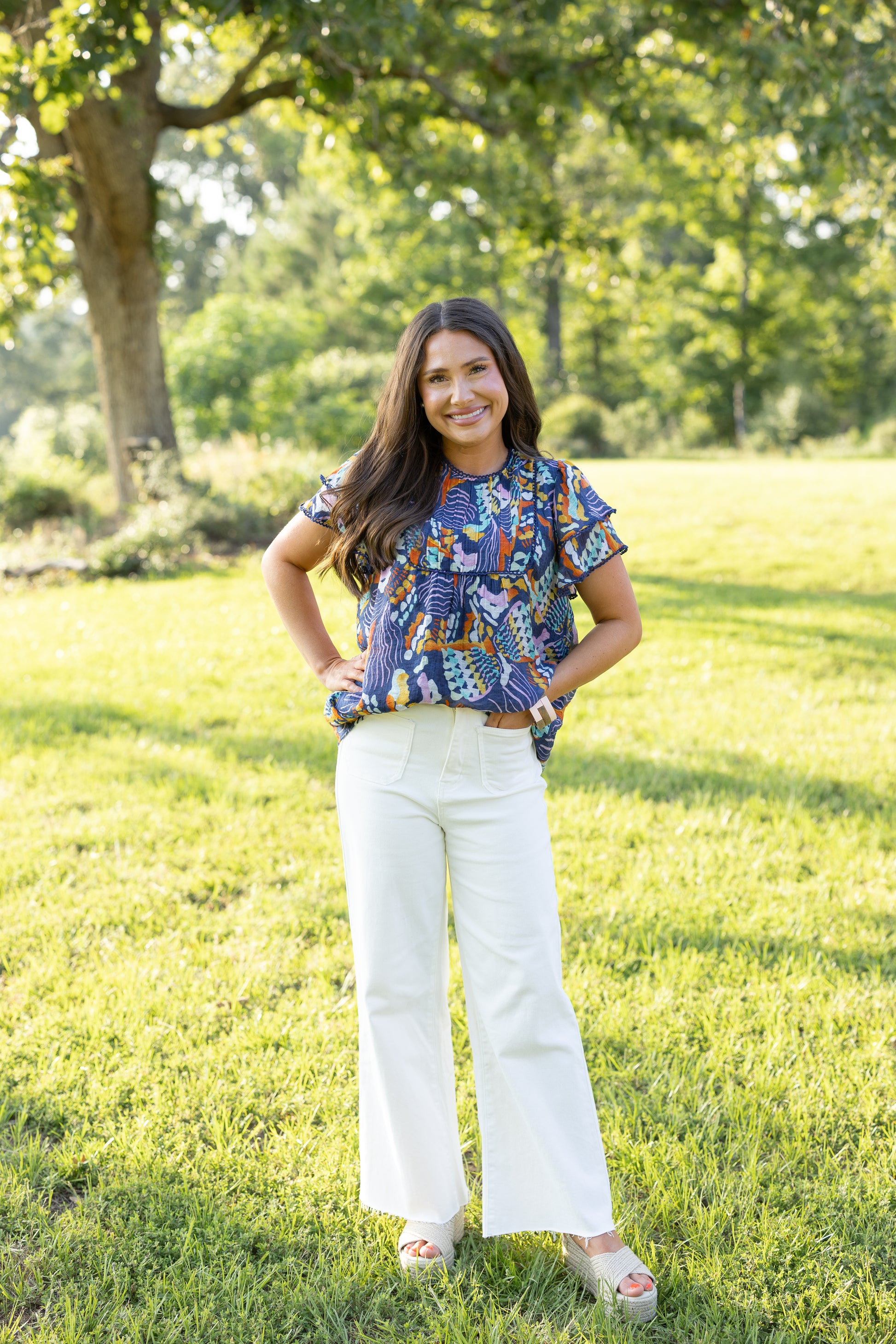 - Abstract Printed Double Ruffle Sleeved Top
